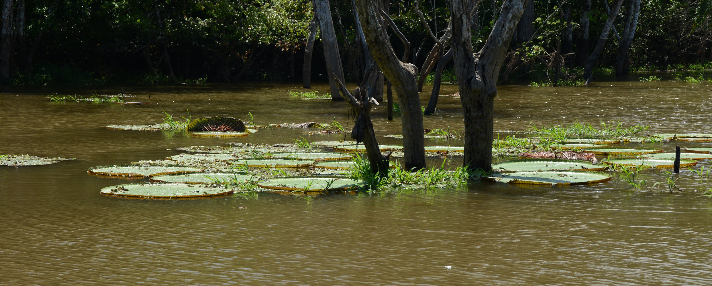 Victoria amazonica population at the edge of lake Januari, Manaos, Amazonas, Brazil