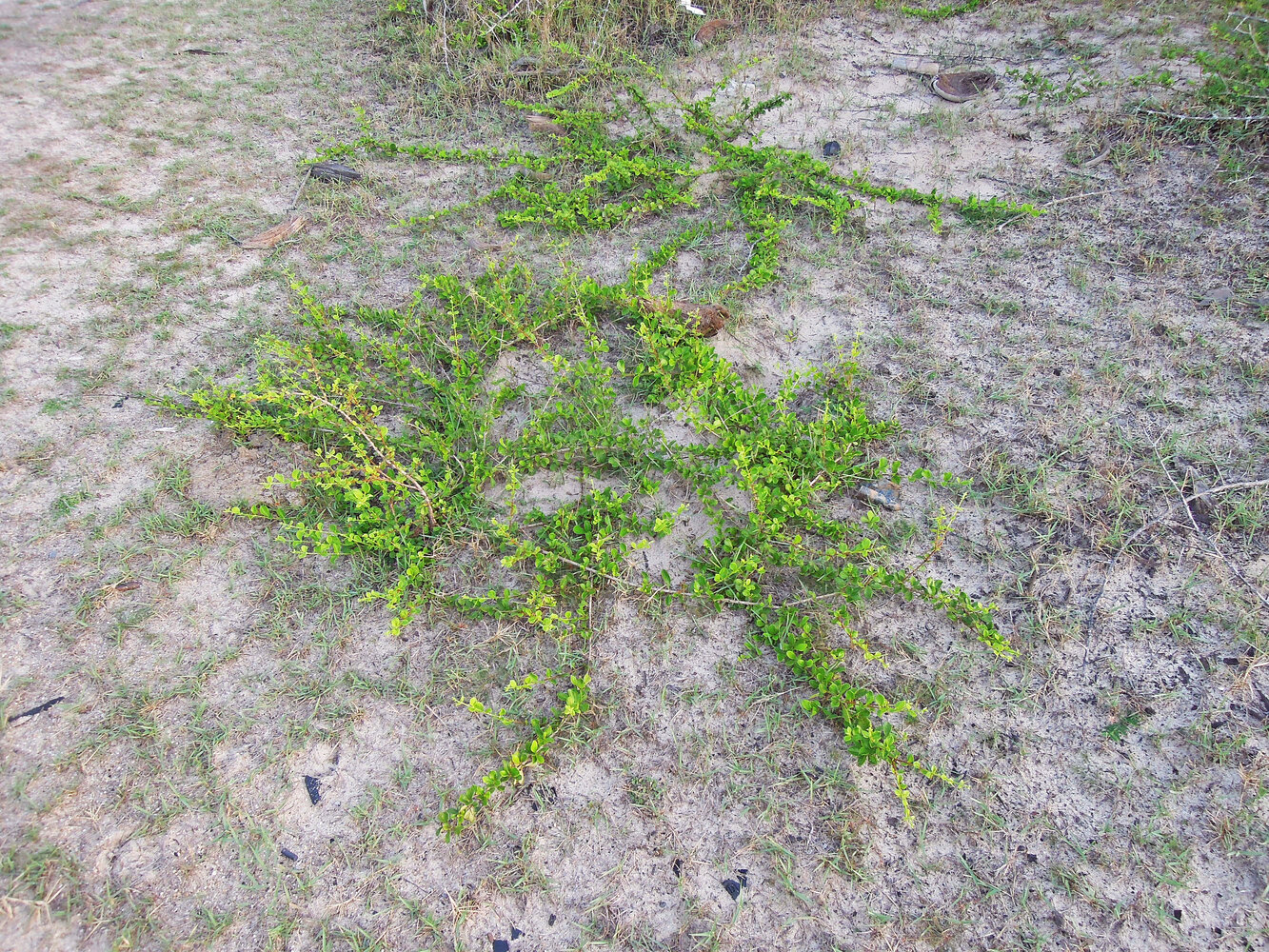 Catunaregam spathulifolia, herbaceous prostrate circular creeping phase and central shrubby phase with plagiotropic lateral branches, Penarik, Trengganu, Malaysia