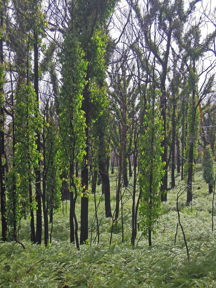 Eucalyptus regrowth along small tree trunks after fire, Lake Saint Clair area, Tasmania