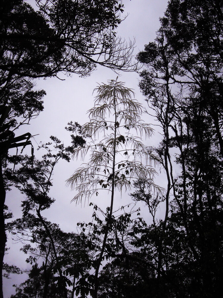 Harmsiopanax ingens, defoliate stem with the terminal inflorescence emerging from the forest edge, Tari, 2500 m asl, Hela, Papua New Guinea