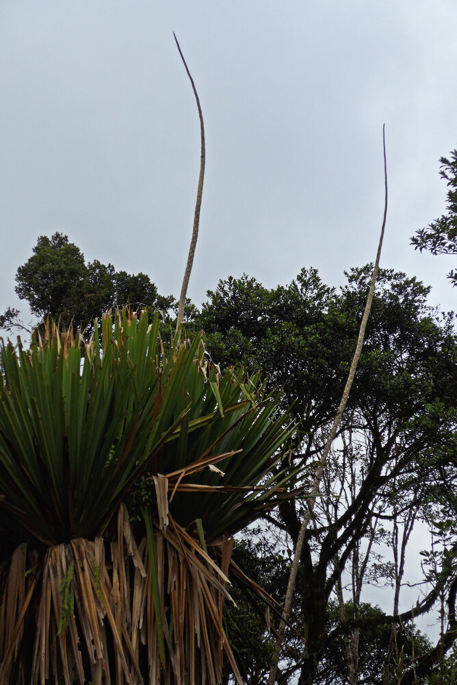 Harmsiopanax ingens, two flowering defoliate monocarpic individuals emerging from the forest canopy, Tari, 2500 m asl, Hela, Papua New Guinea