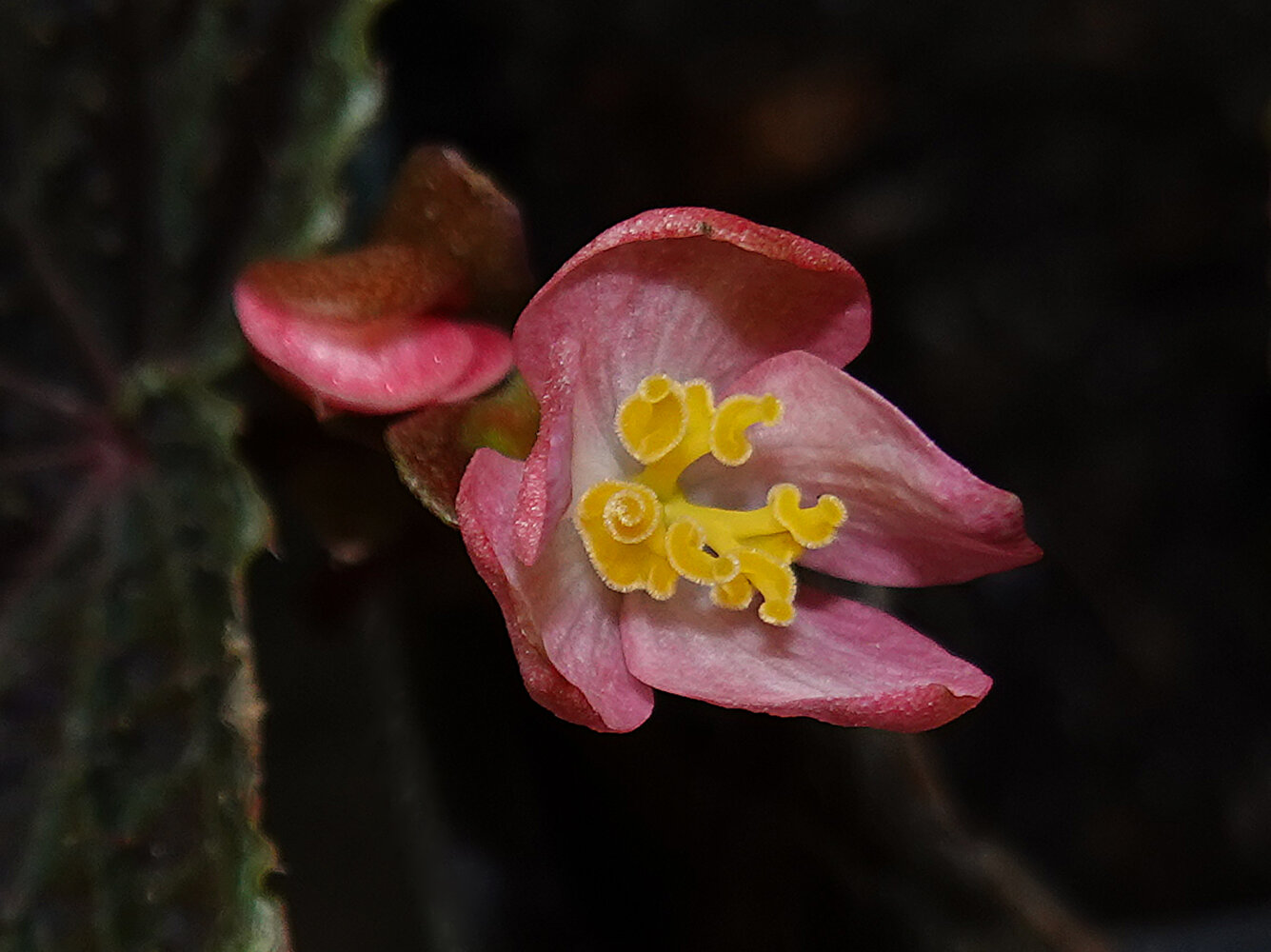 Begonia ruthiae, slight blue iridescence of the leaf under flash light and female flower just before anthesis, Danum Valley, Sabah, Borneo