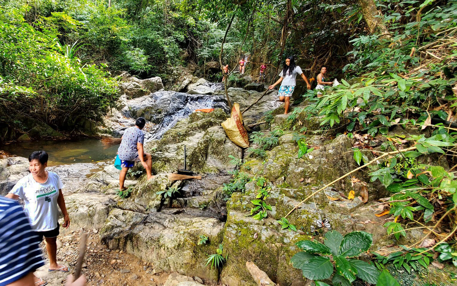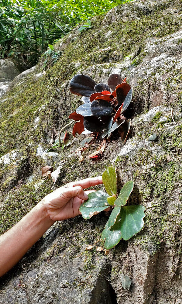 Begonia blancii, some individuals surviving on the vertical faces of the rocks adjacent to the overtouristic trail, Bulalacao Falls, El Nido, Palawan, Feb. 2025, photo R. Dupont