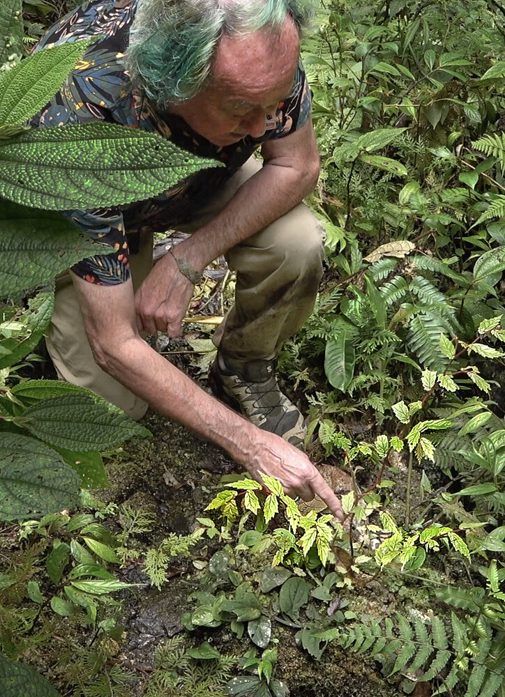 Patrick Blanc observing the erect but plagiotropic stems of Begonia arfakensis, Kwau, 1500 m asl, Arfak Mts, West Papua, May 2025