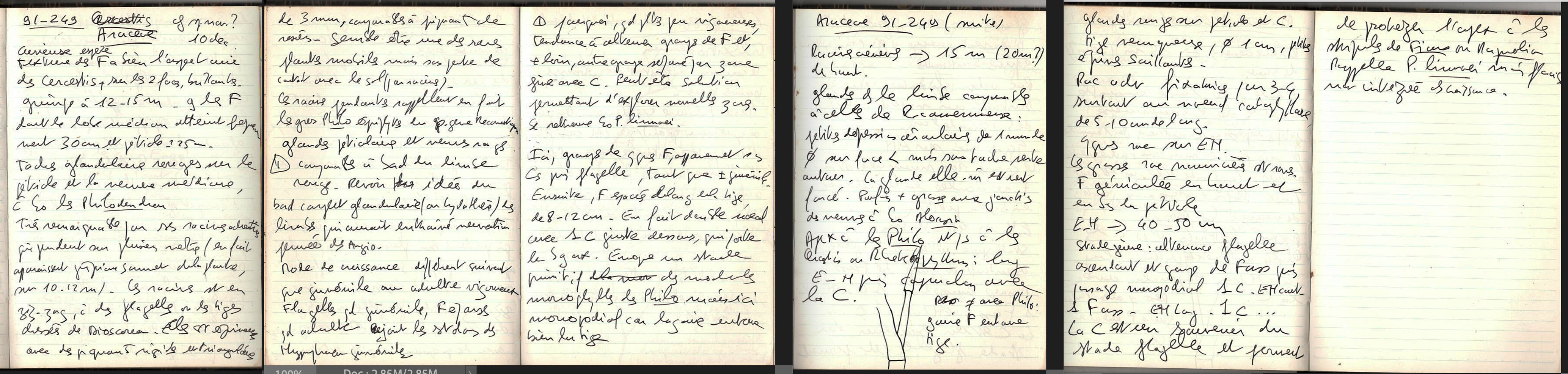 Field note book by Patrick Blanc on 10th Dec. 1991, explaining the growth habits of his newly discovered Cercestis sp. 91-249, finally named Cercestis blancii in 2025, Ebodje, Campo, Cameroon