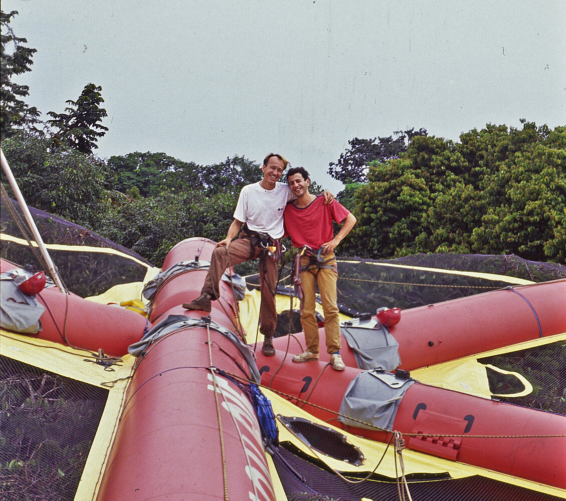 Patrick Blanc and Pascal Héni on the Canopy Raft, 40 m above forest floor, both happy just after Patrick discovered Cercestis blancii while climbing to the top, Ebodje, Campo, Cameroon, 1991, photo by Gilles Ebersolt