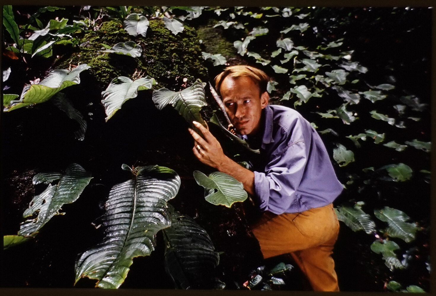 Patrick Blanc observing a sample of a male Piper guineense, Canopy Raft expedition, Campo, Cameroon, 1991