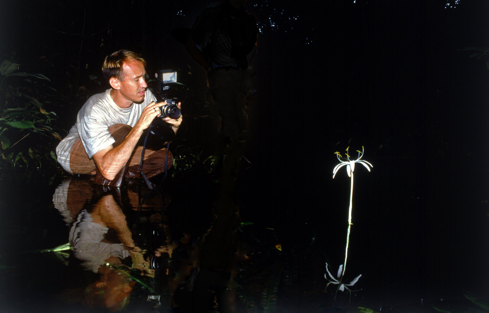 Patrick Blanc photographying Crinum natans in a forest stream, Campo, Cameroun, Dec. 1991