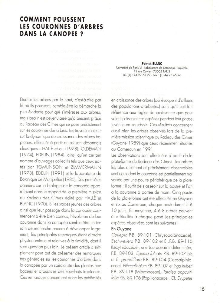 Blanc P. - 1992 - Comment poussent les couronnes d'arbres dans la canopée ? In F. Hallé et O. Pascal Eds, Biologie d'une canopee de forêt equatoriale 2 , Fondation ELF, Paris, 155 - 172