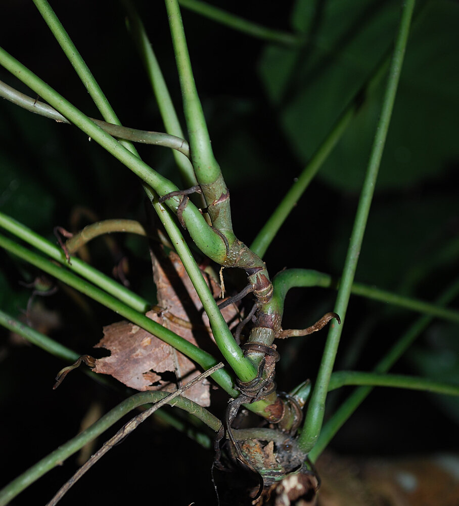 Cercestis camerunensis, base of seedlings exhibiting establishment growth through increasing diameter of stem connected to new adventitious roots