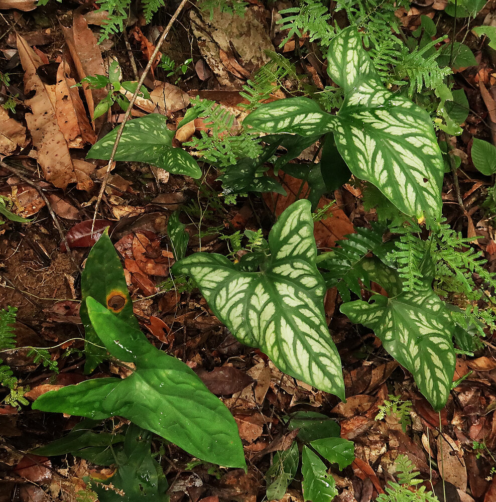 Cercestis mirabilis, a bright silver patched leaves individual and a plain green one side by side in forest understory, Ebodjé, Campo, Cameroon