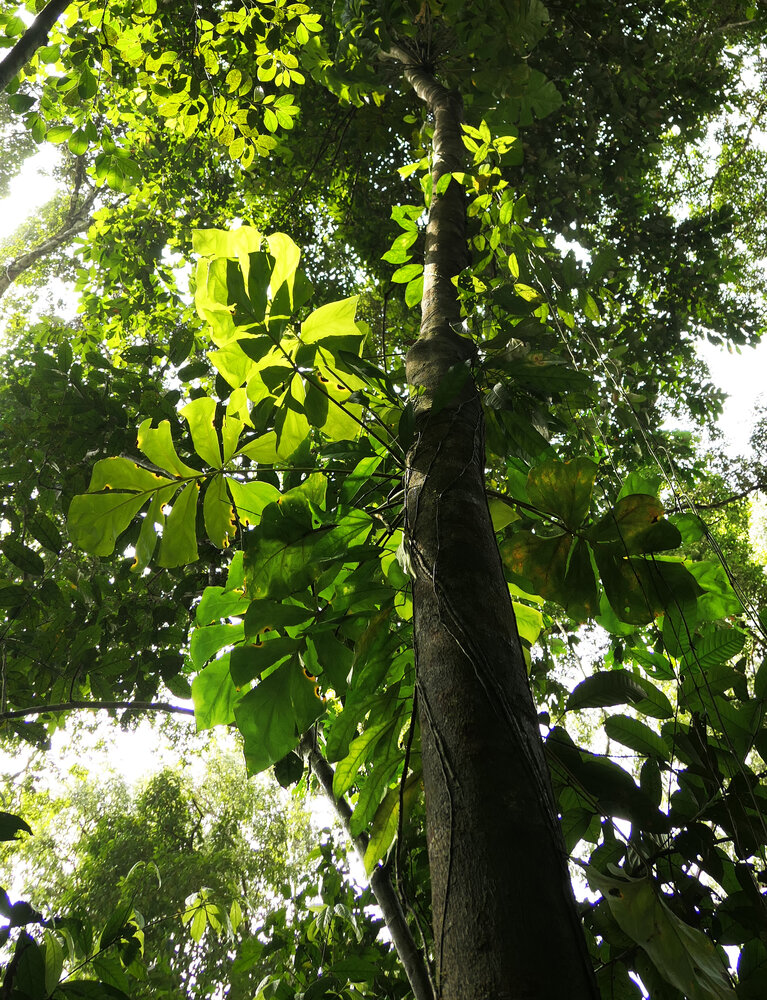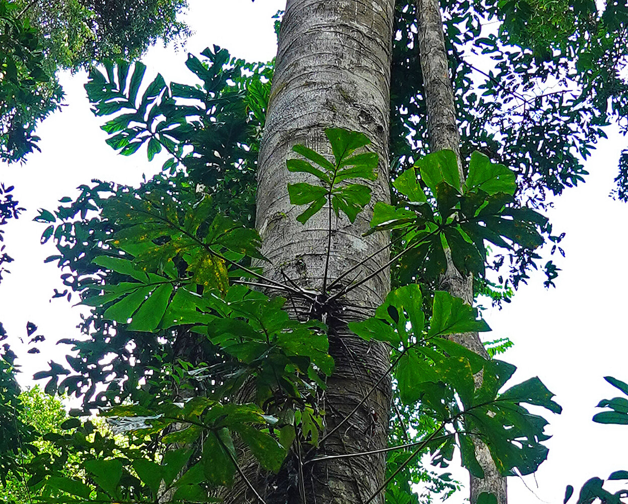 Cercestis mirabilis, successive leafy rosettes along tree trunk host, Campo, Cameroon