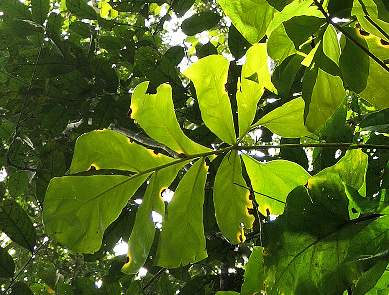 Cercestis mirabilis, leaves through sun flecks, Campo, Cameroun copie