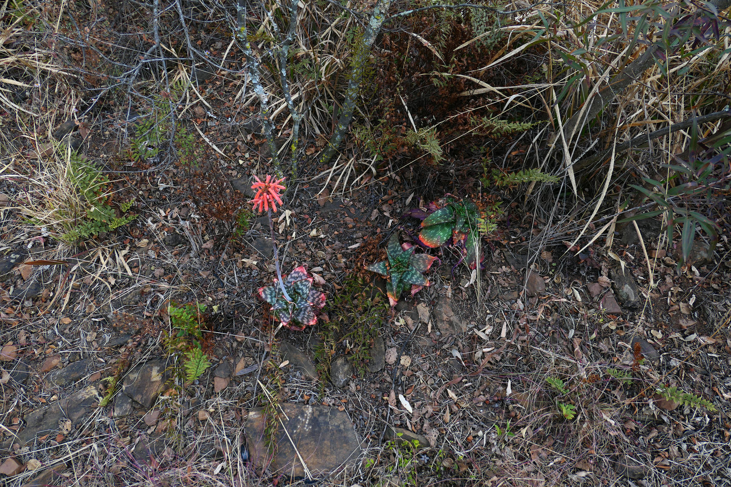 Aloe chabaudii, greyish brown white spotted form on rocks in dry forest understory, Mumbo Island, Lake Malawi NP