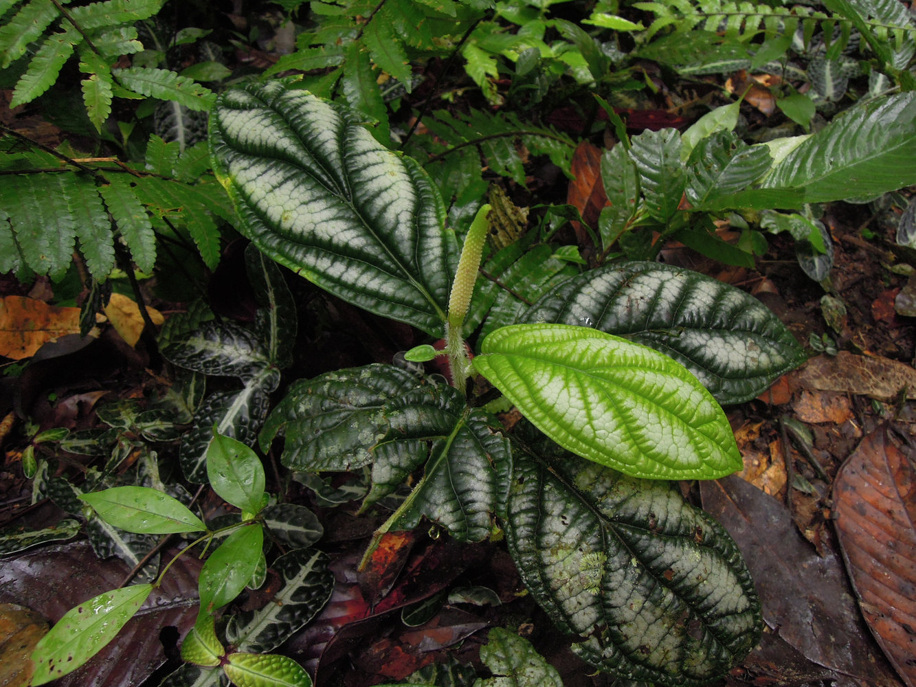 Piper sp., silver mottled parenchyme pattern between nerves, an opposite structural design to Cosmianthemum obtusifolium with silver design along the main nerves, Borneo Highlands, Padawan, Sarawak, Borneo