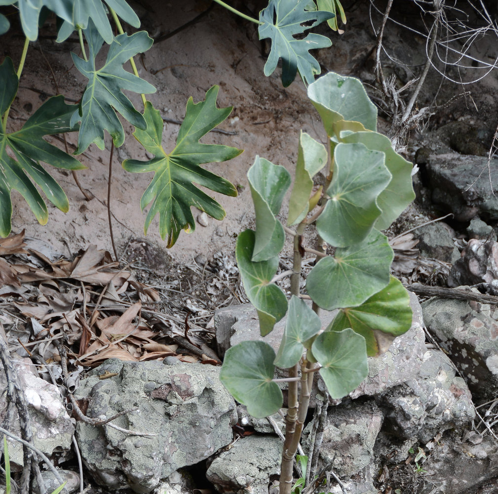 Piper hongkongense, monopodial creeping stem with hairy round leaves and detached horizontal sympodial floriferous lateral stems wth ovate hairless leaves, Victoria Peak, Hong Kong