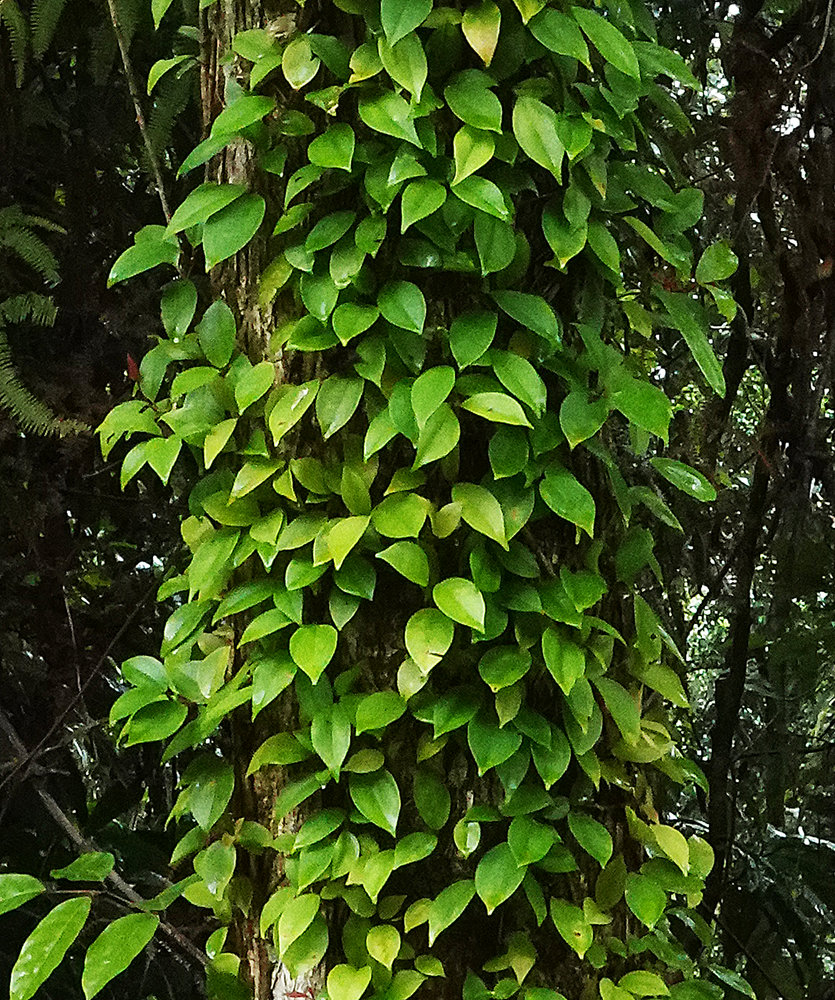 Medinilla erpetina, climbing thanks to adventitious roots, densely branched and totally covering a tree trunk, Imbu Rano, Kolombangara, Solomon Islands