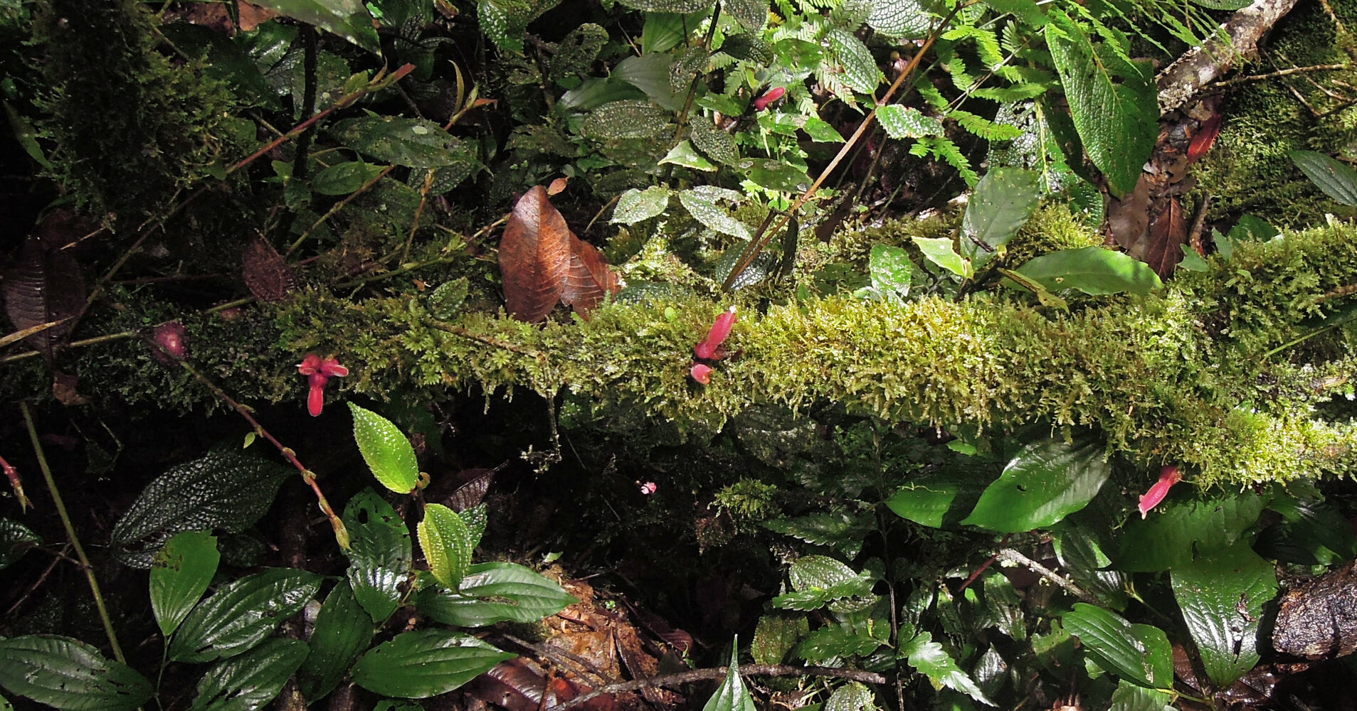 • Cyrtandra aundensis, flowers emerging from a thick cushion of decaying bracts, Kumul, 2800 m asl, Mount Hagen, Papua New Guinea