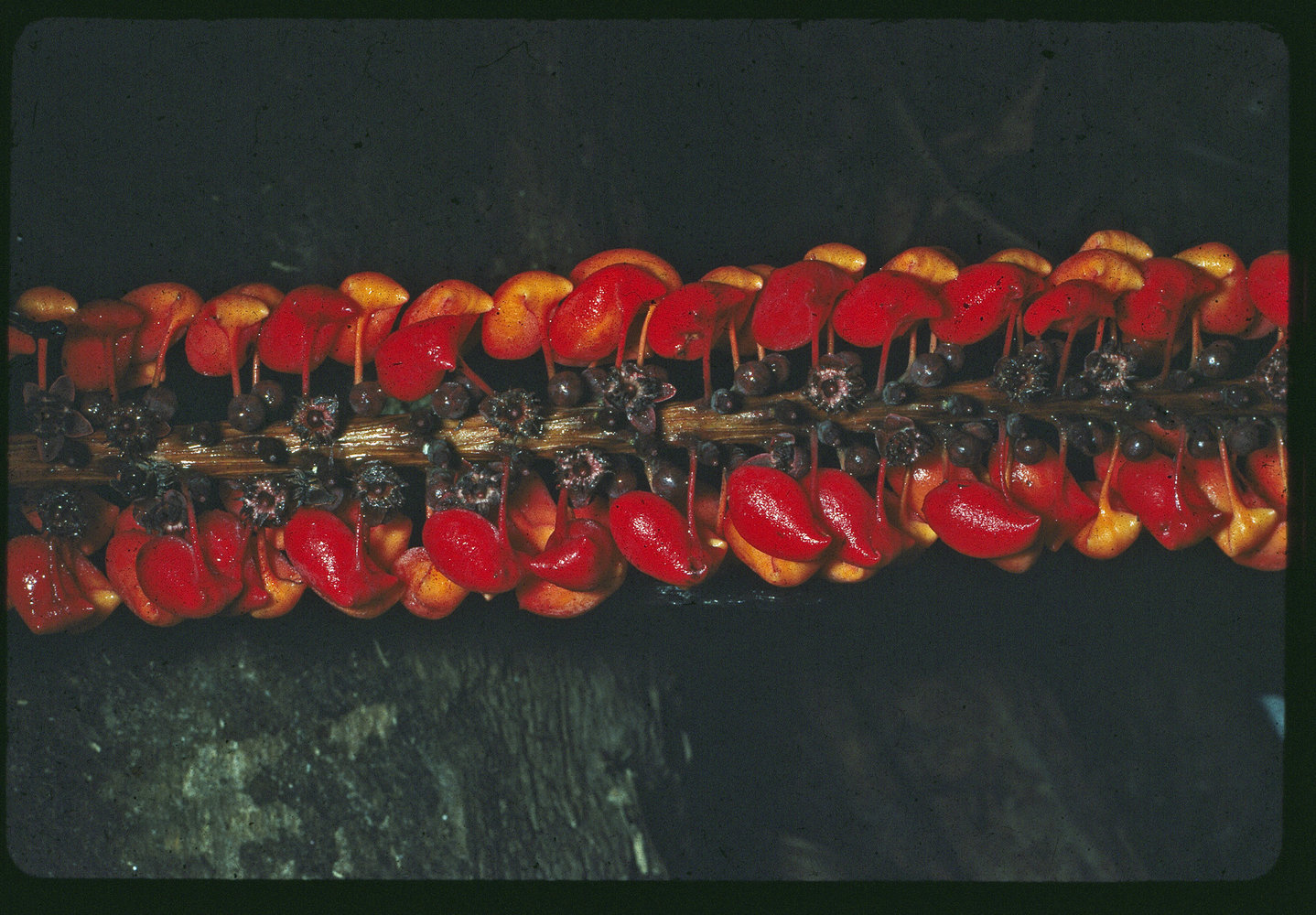 Norantea guianensis, inflorescence with small dull brown flowers and bright red bracts modified into extrafloral nectaries pouches, Petit Saut, French Guyana
