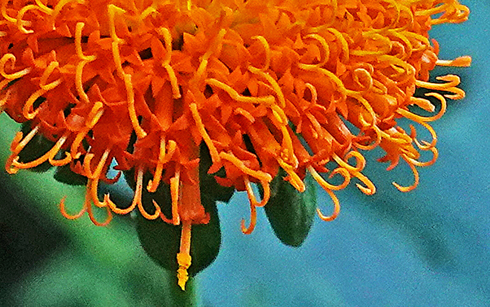 Verbesina crocata, tubular bright orange tube of the disc florets, Finca el Pilar, Antigua, Guatemala