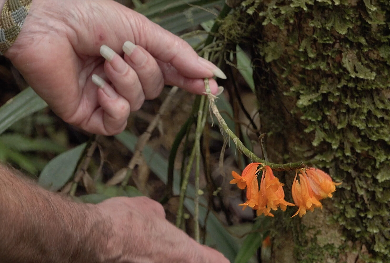 Patrick Blanc showing the inflorescence of Dendrobium glaucoviride, Kwau, 1600 m asl, Arfak Mts, West Papua, May 2025