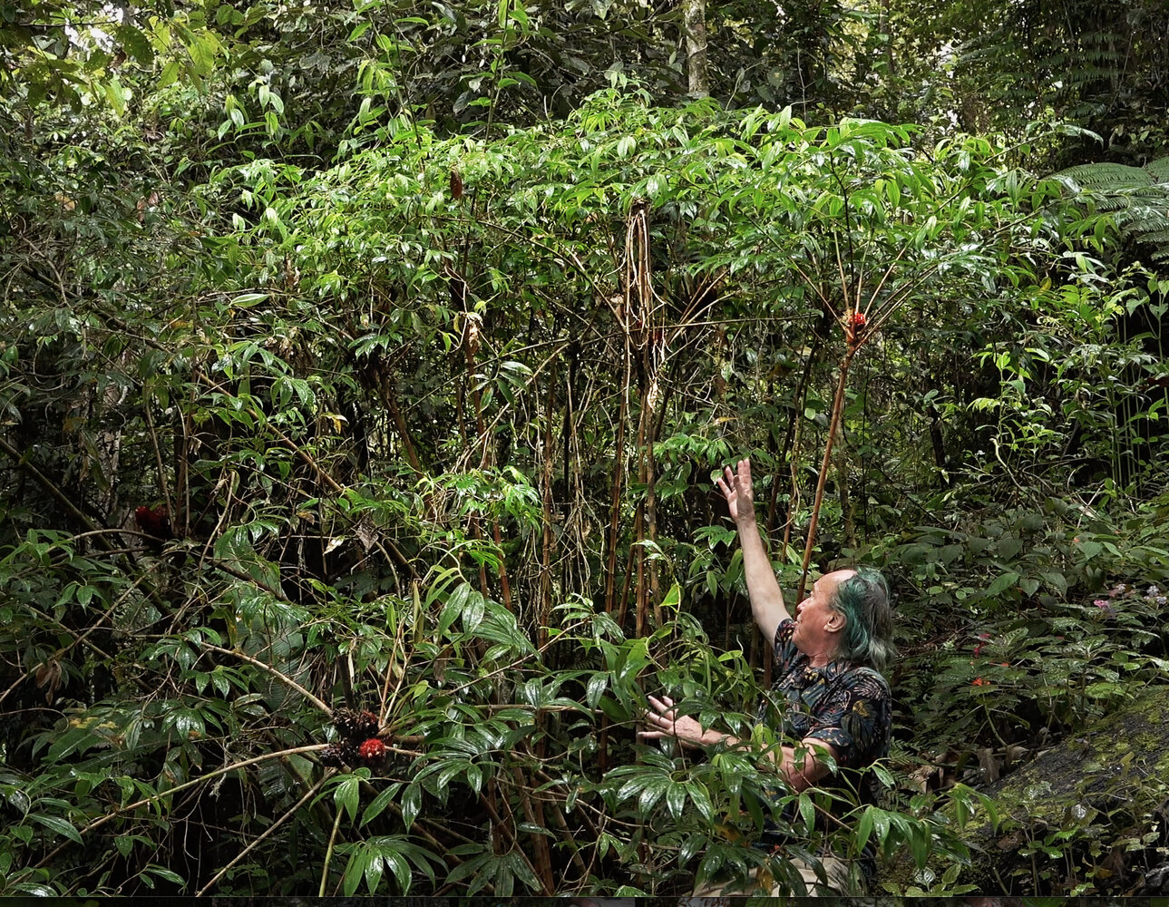 Patrick Blanc showing a population of vertical cane stems of Tapeinochilos sp. nov.Gideon in prep. ending in radiating leafy stems and terminal inflorescences, Kwau, 1600 m asl, Arfak Mts, West Papua, May 2025