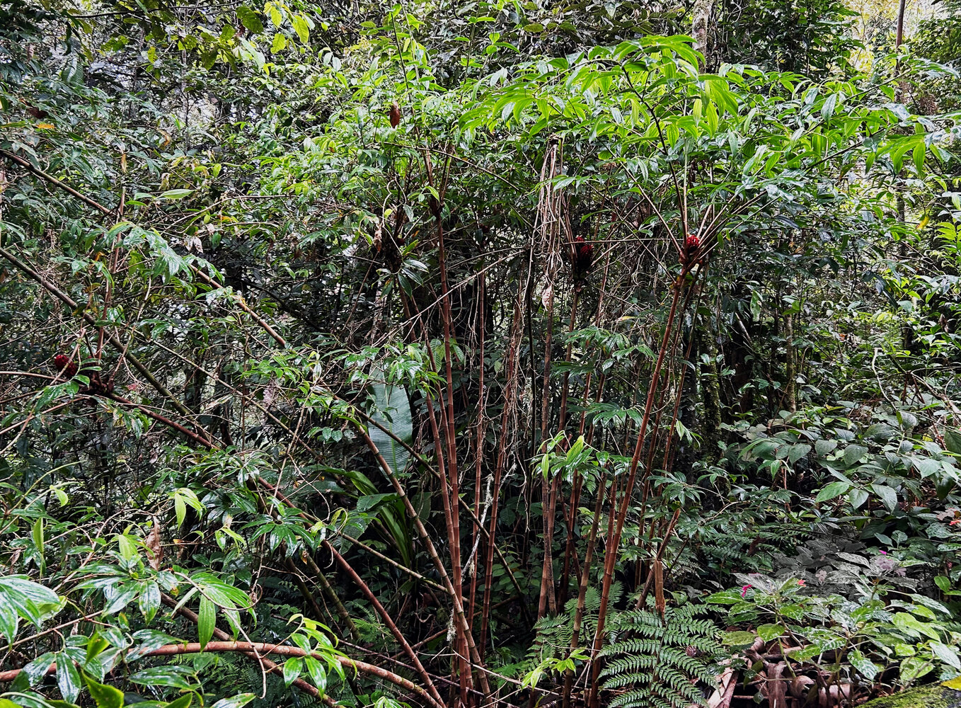 Tapeinochilos sp. nov., population of erect cane stems branching and flowering at the top, Kwau, 1600 m asl, Arfak Mts, West Papua