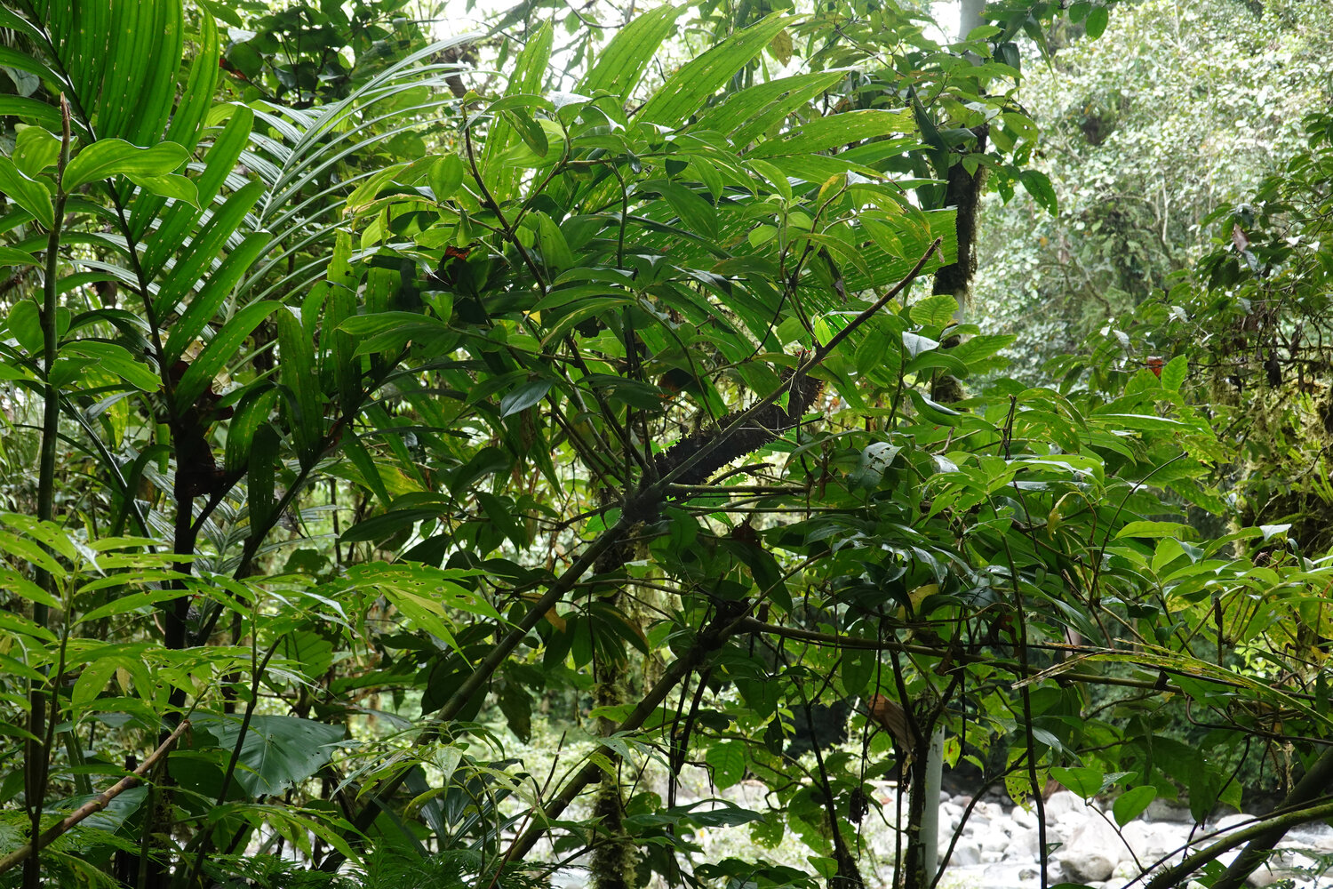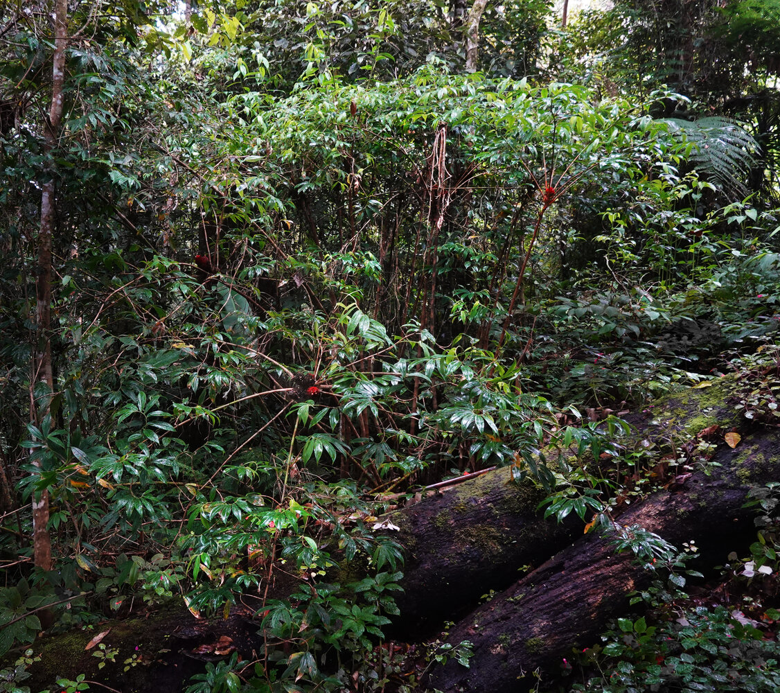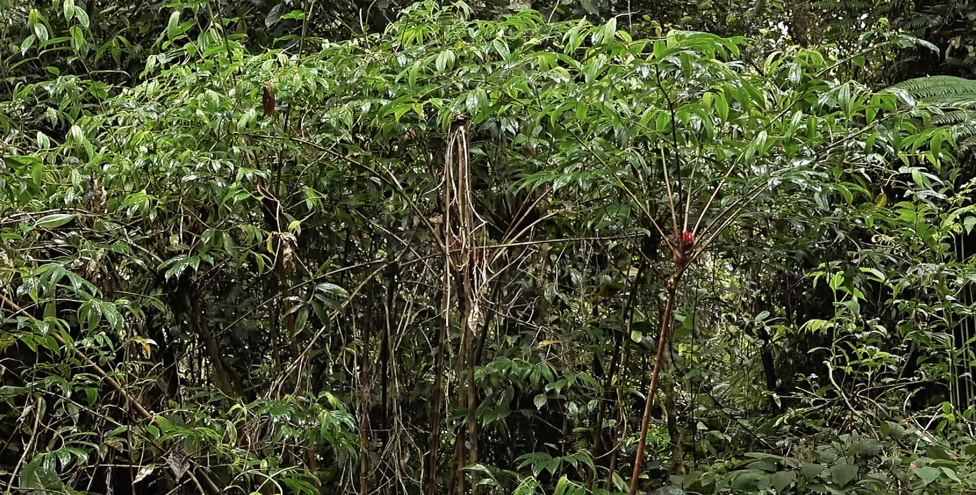 Tapeinochilos sp. nov., population of erect leafless cane stems ending in numerous radiating branched leafy shoots creating a continuous green canopy 3 meters above the soil, Kwau, 1600 m asl, Arfak Mts, West Papua