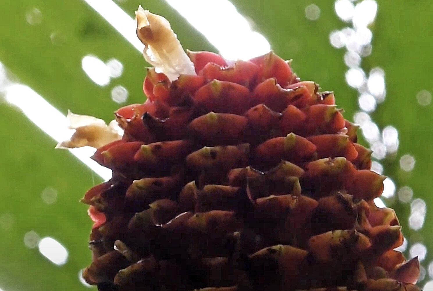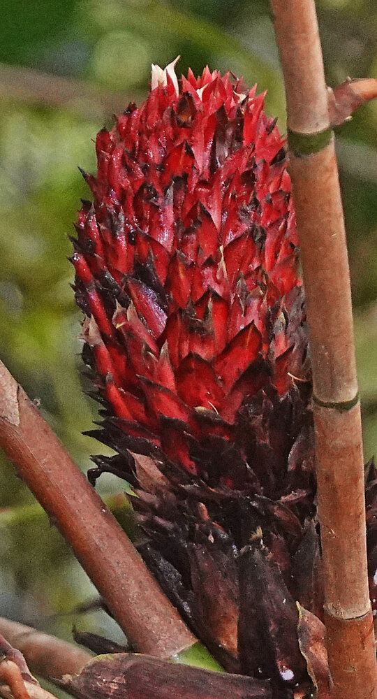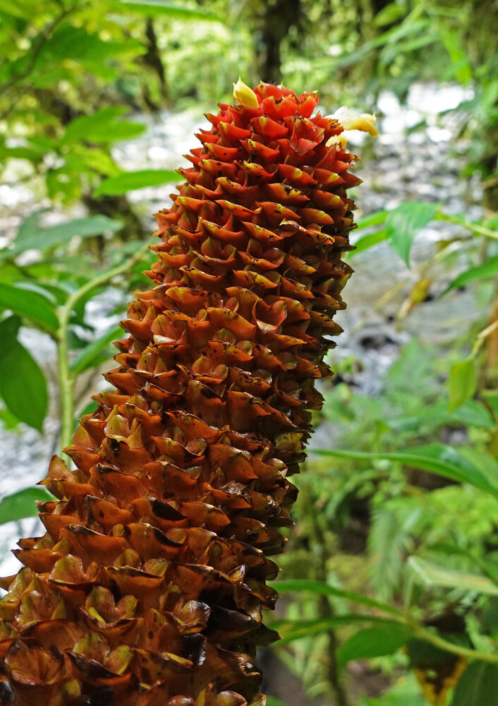 Tapeinochilos cf. salomonensis, decaying inflorescence with reddish brown bracts, some new flowers still attearing at the top, Tenaru Falls, Guadalcanal, Solomon Islands