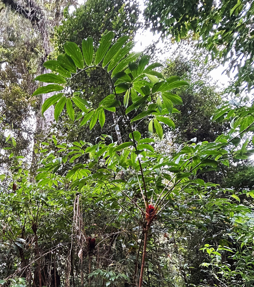 Tapeinochilos sp. nov., two inflorescences at the top of the cane stem, just above the radiating lateral leafy branches, Kwau, 1600 m asl, Arfak Mts, West Papua