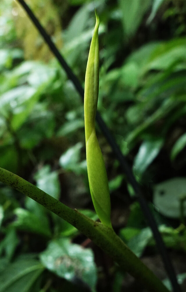 Chlorospatha atropurpurea, inflorescence emerging from the top of the closed leaf sheath, Mashpi FR, Pichincha, Ecuador