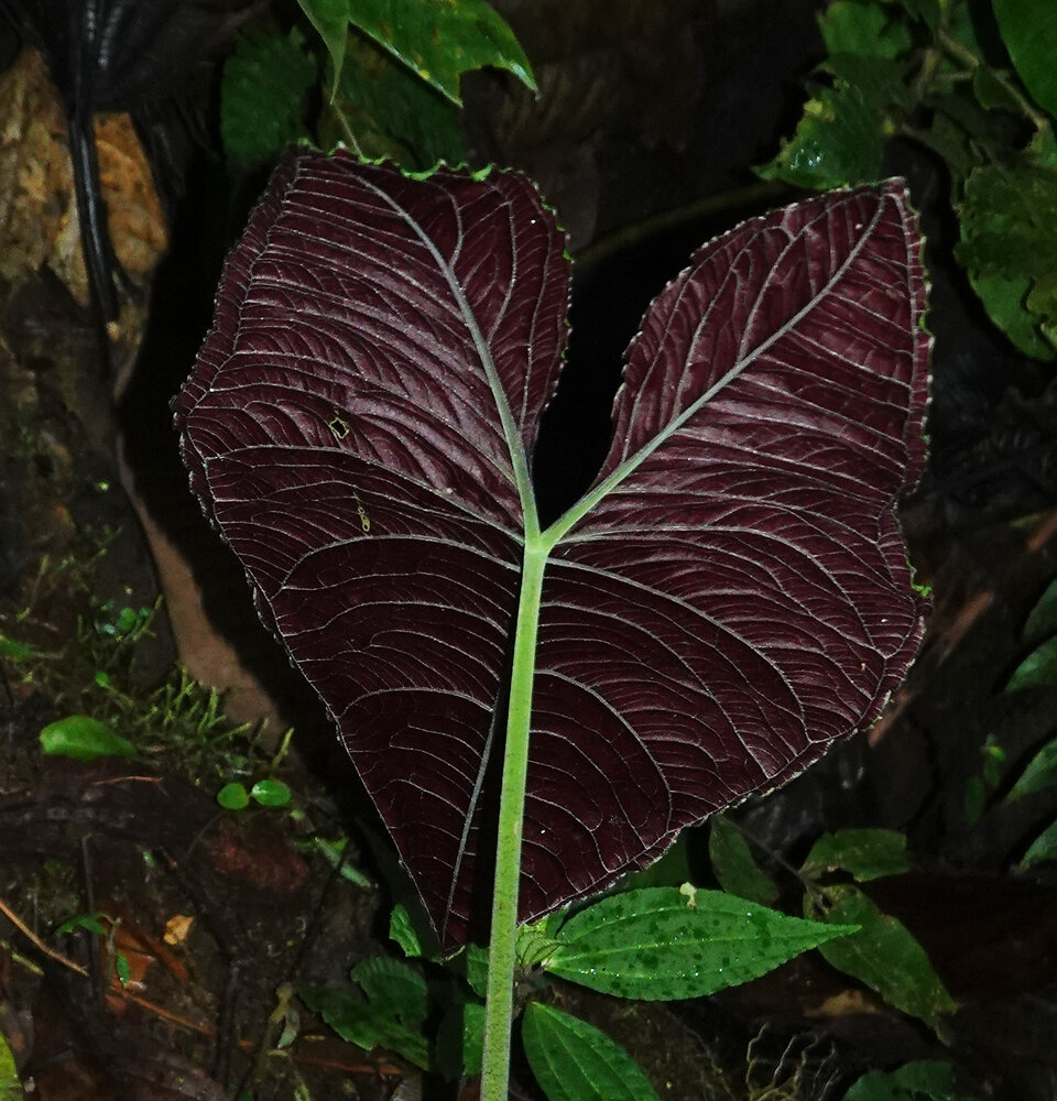Chlorospatha atropurpurea, large leaf with bright dark purple anthocyanic lower surface, Mashpi FR, Pichincha, Ecuador