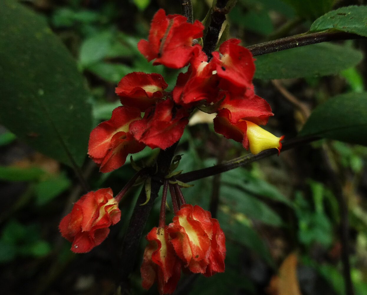 Glossoloma sprucei, red petioled leaves and yellow fimbriate calyx, Mashpi FR, Pichincha, Ecuador