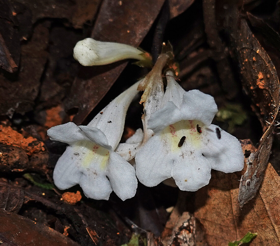 Cyrtandra basiflora, flowers at anthesis visited by Drosophila flies, Poring, Kinabalu NP, 400 m asl, Sabah, Borneo