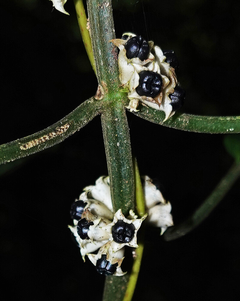 Paraphlomis javanica, sessile clustered fruits with bright white calyx and shiny black nutlets, Poring, 600 m asl, Kinabalu NP, Sabah, Borneo