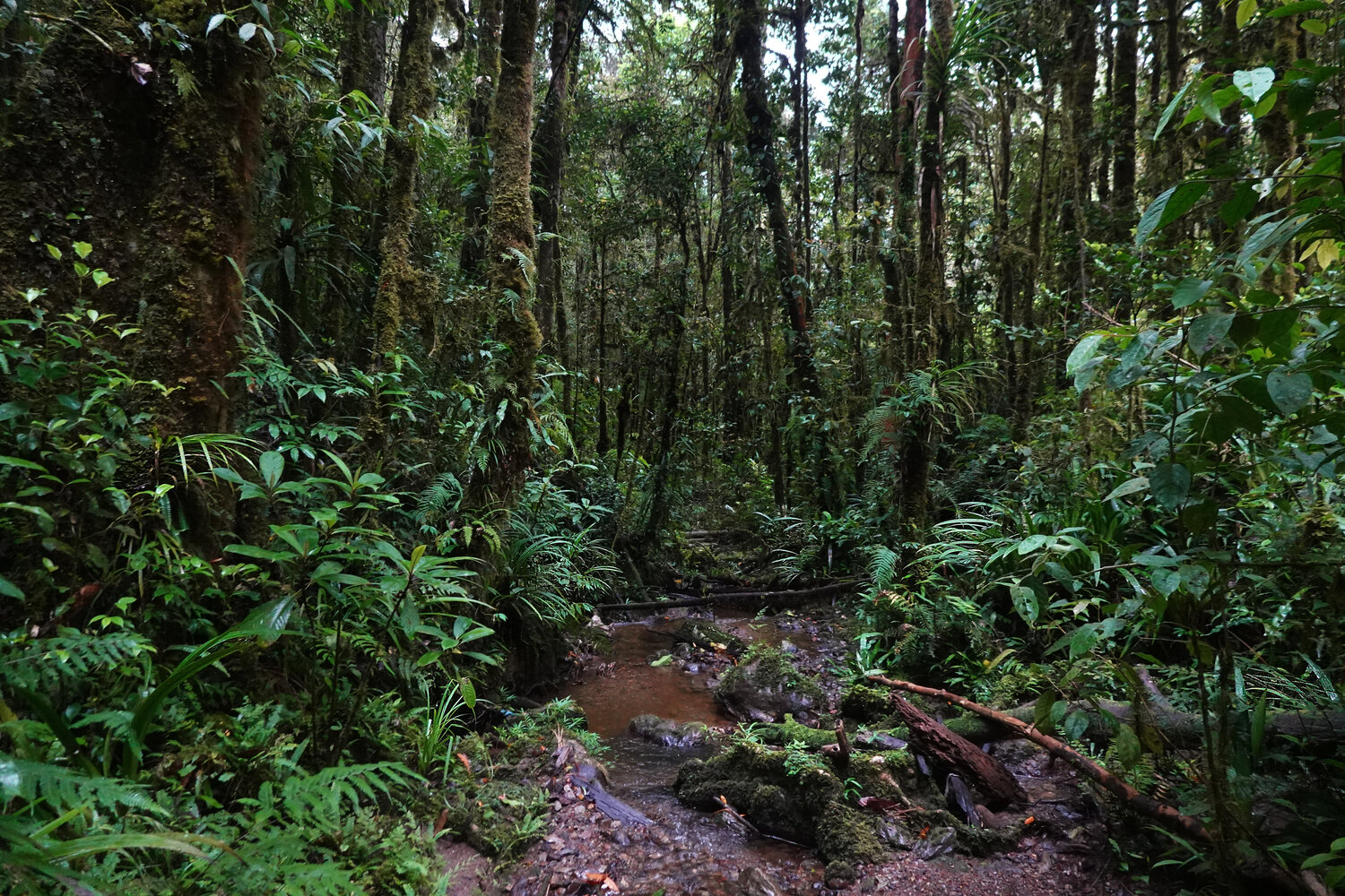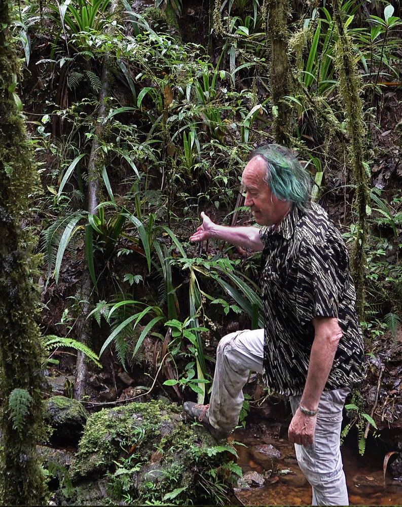 Patrick Blanc showing Helmholtzia novoguineensis in its mossy forest habitat just above a small stream, Manusela NP, Seram, Moluccas, April 2024