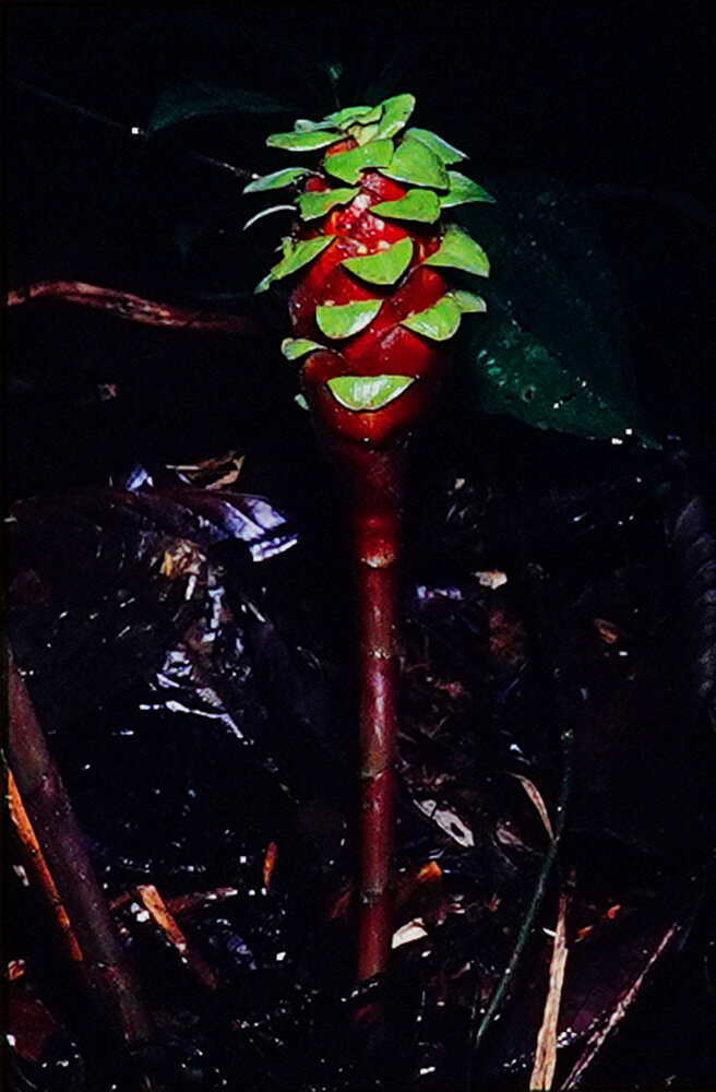 • Costus claviger, leafless stem with terminal infructescence, mature fruits with bright red pulp in the axil of the persistent bright green bracts, Nouragues CNRS field station, French Guyana