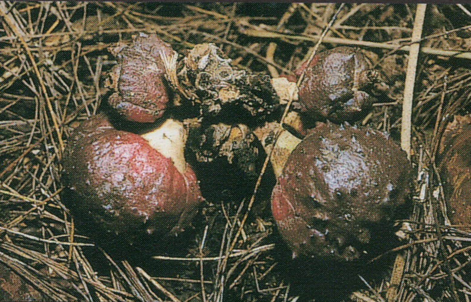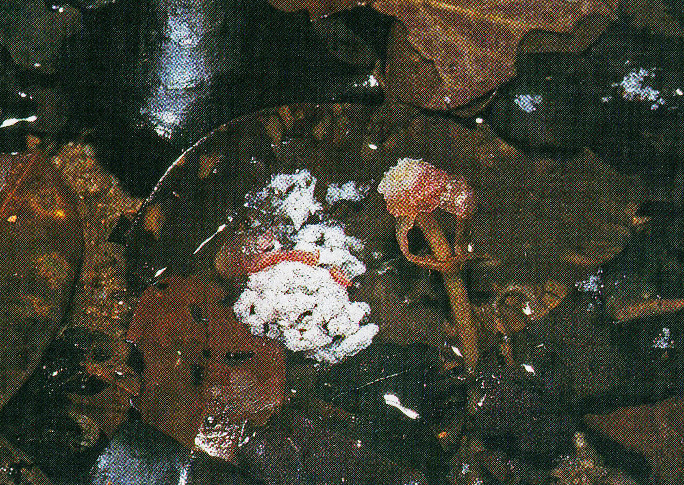 Barclaya kunstleri, the envelope of the ripe fruit decays, releasing the small black seeds embedded in a white floating air filled pulp allowing water dispersal, Selangor, Malaysia