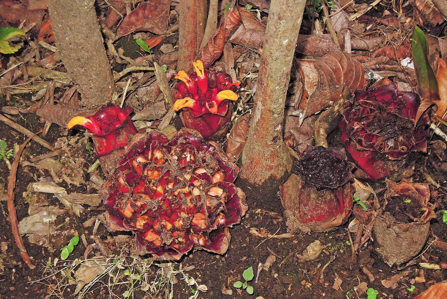 Johannesteijsmannia lanceolata, orange ripe corky fruits on old inflorescence axis at the base of the funnel shaped leaf crown, Bukit Panchor, Penang, Malaysia