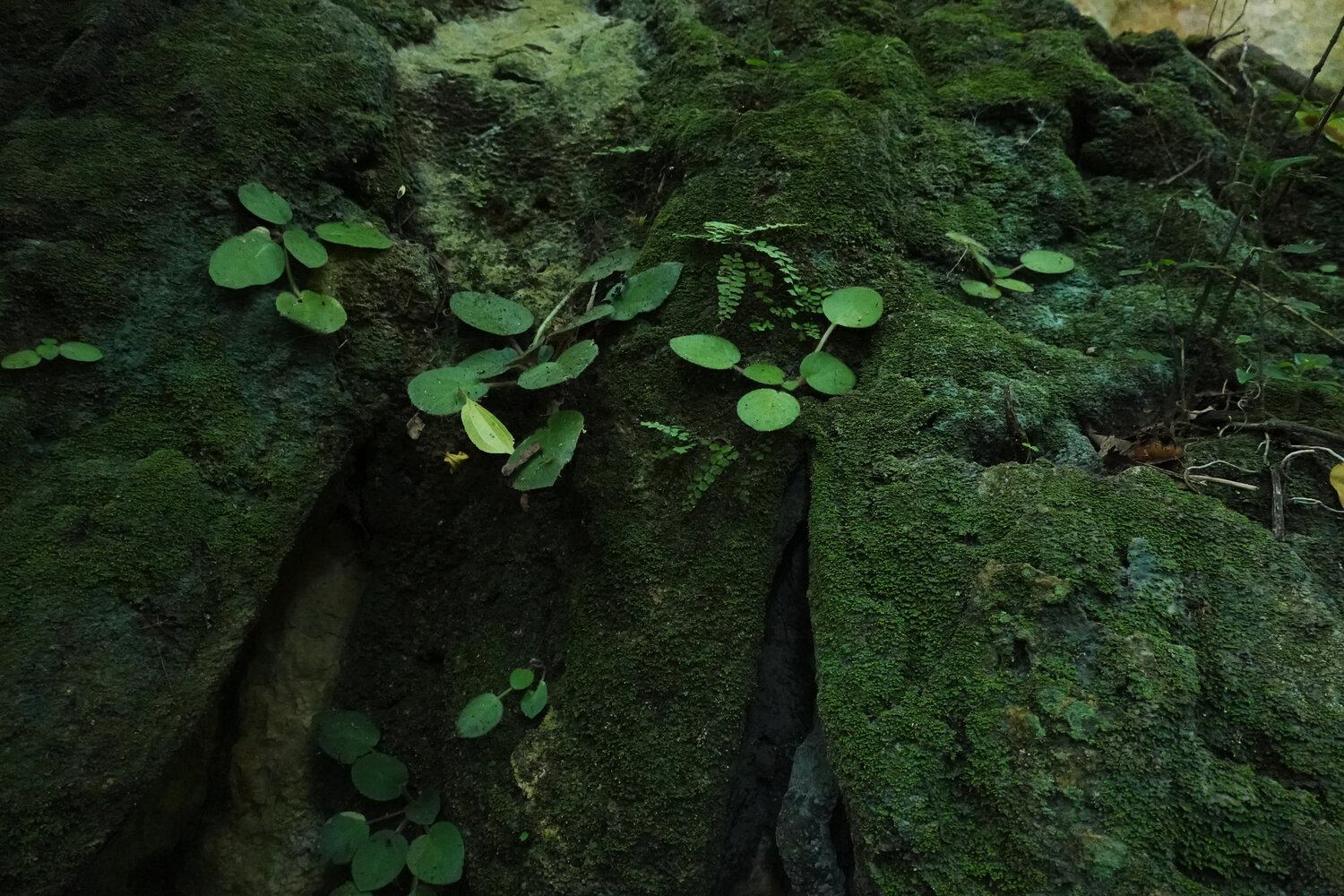 Streptocarpus (syn. Saintpaulia) ionanthus, young individuals and anisocotylous seedlings on vertical humid mossy karst, Amboni caves, Tanga, Tanzania