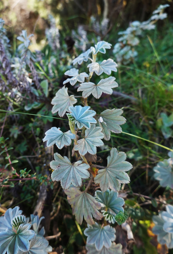Alchemilla haumannii, bright silver blue leaves due to densely appressed refringent hairs, 3600 m asl, Bale NP, Ethiopia
