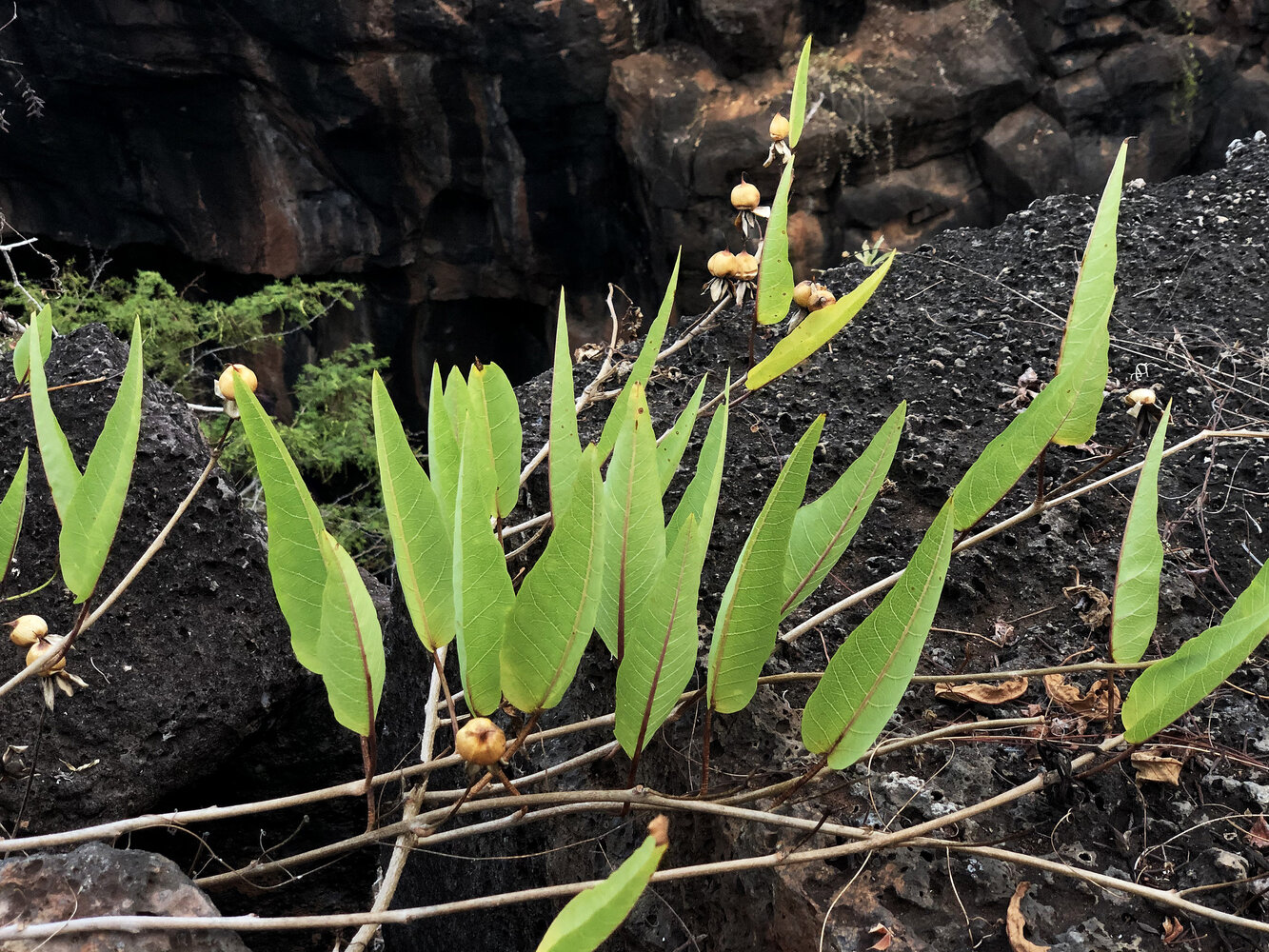 Ipomoea habeliana creeping on lava rocks, erect triangular lanceolate leaves, Santa Cruz, Galapagos