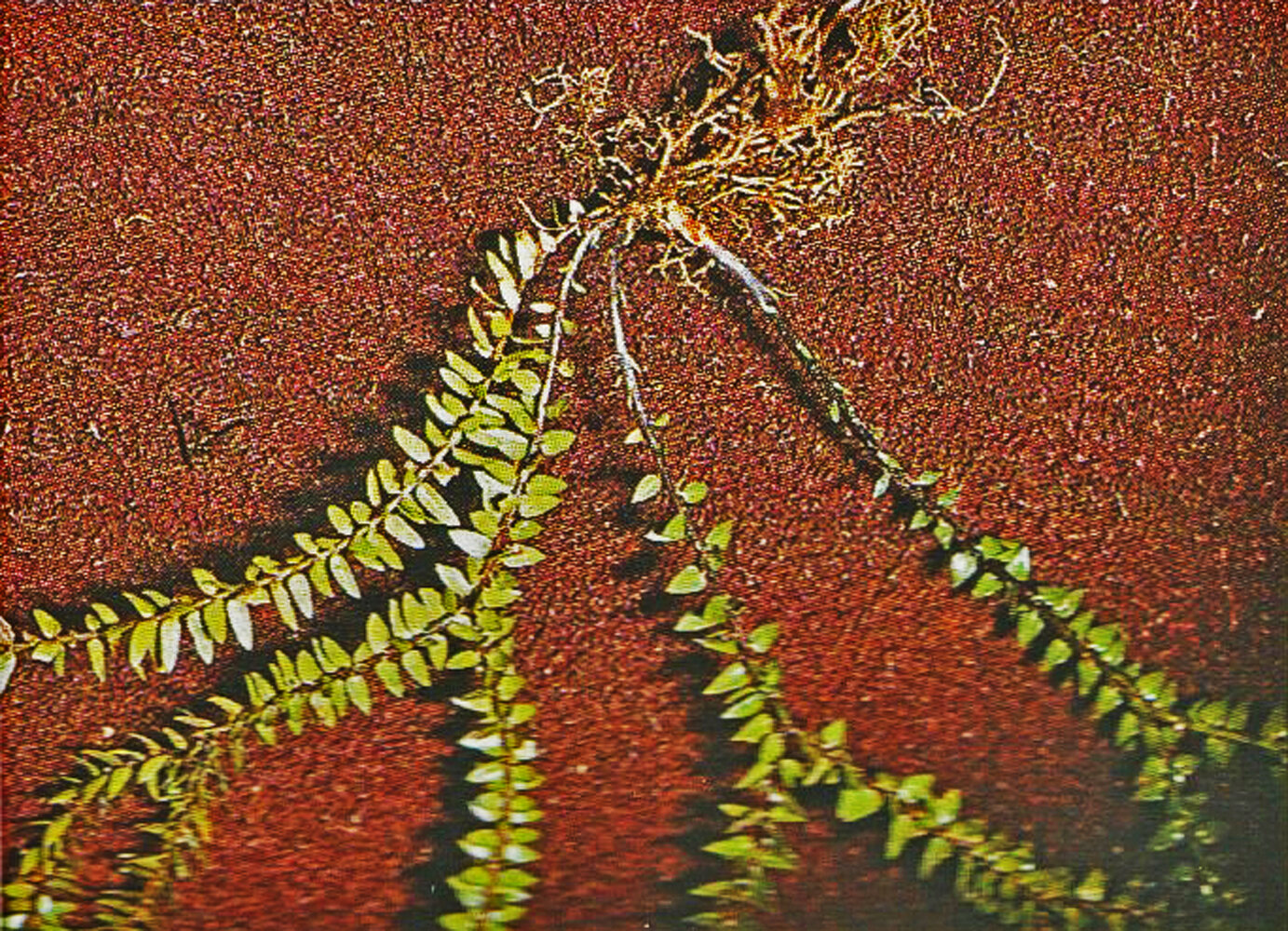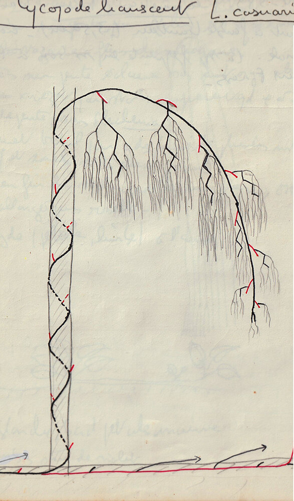 Lycopodiastrum casuarinoides, schematic representation by Patrick Blanc of growth habits with the blocked stems later producing strictly strbiliferous stems in red, Cameron Highlands, July 15th 1984