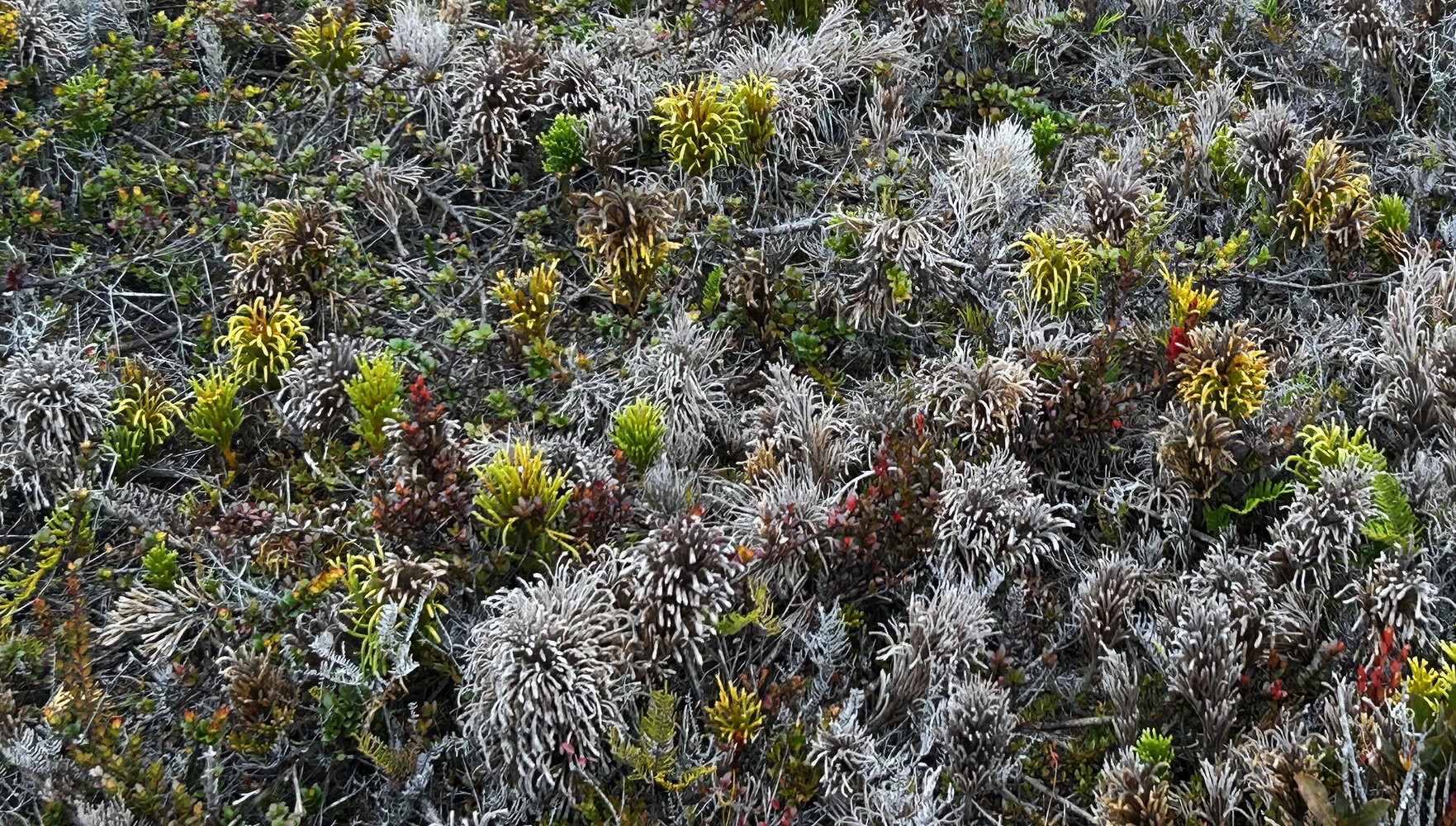 Lycopodium (Palhinhaea) hydrophilum, dense population of erect living green arbuscular stems and old dead bright grey persistent Lichen-like branched stems, Anggi Lakes, 2300 m asl, Arfak Mts, West Papua
