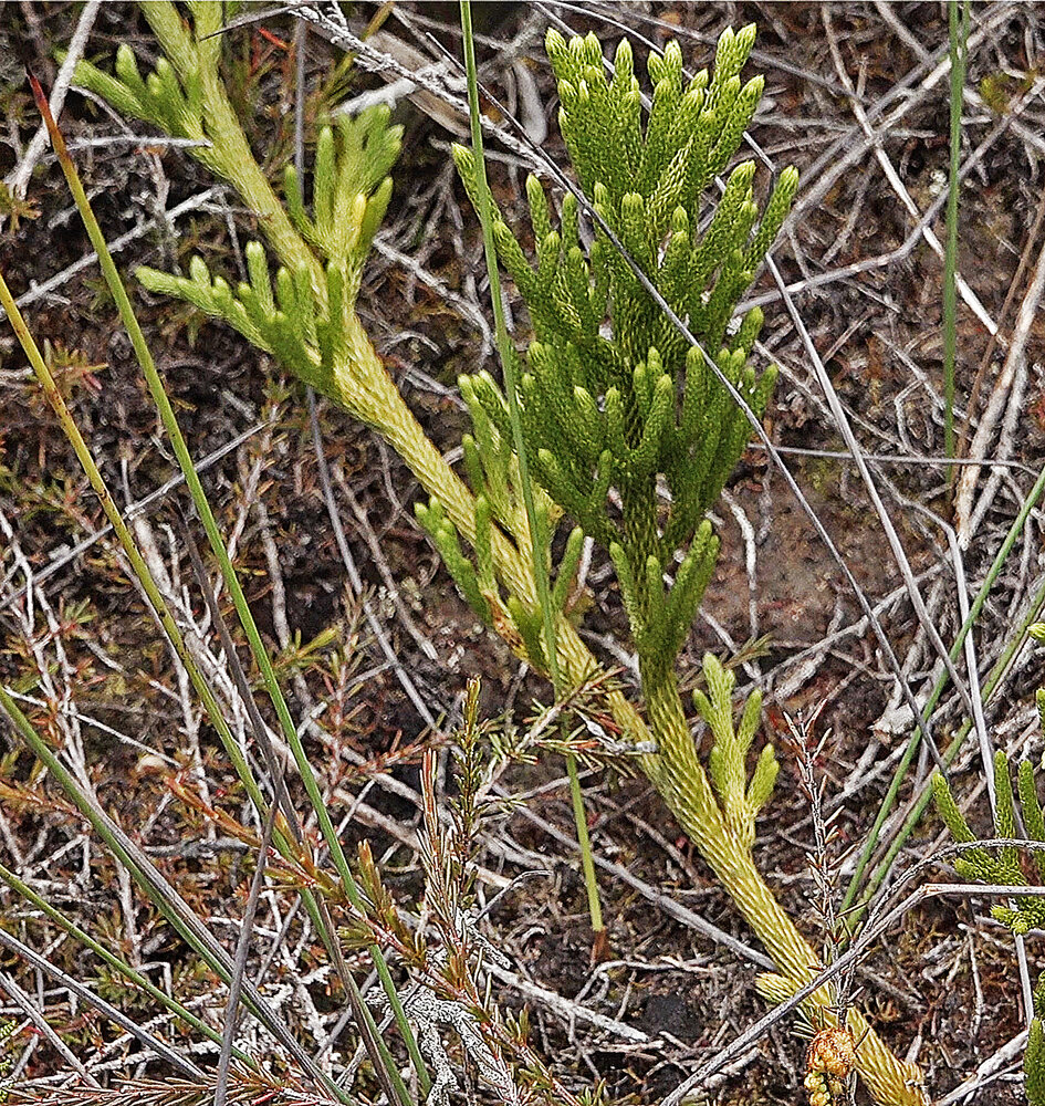 Lycopodium (Palhinhaea) hydrophilum, some living branched erect fir like stems and numerous long lasting dead stems very Lichen-like in wet sandy savanna, Anggi Lakes, 2300 m asl, Arfak Mts, West Papua