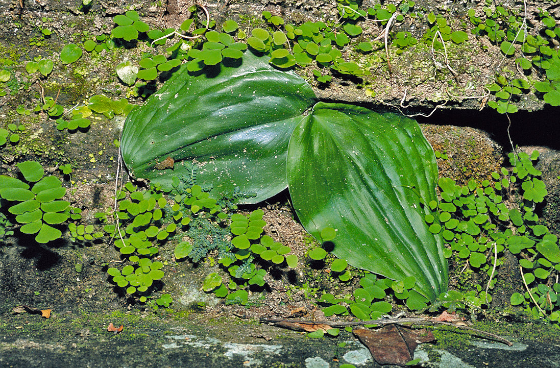 Kaempferia sp with tuber between the stones of Beng Melea temple, Angkor, Cambodia
