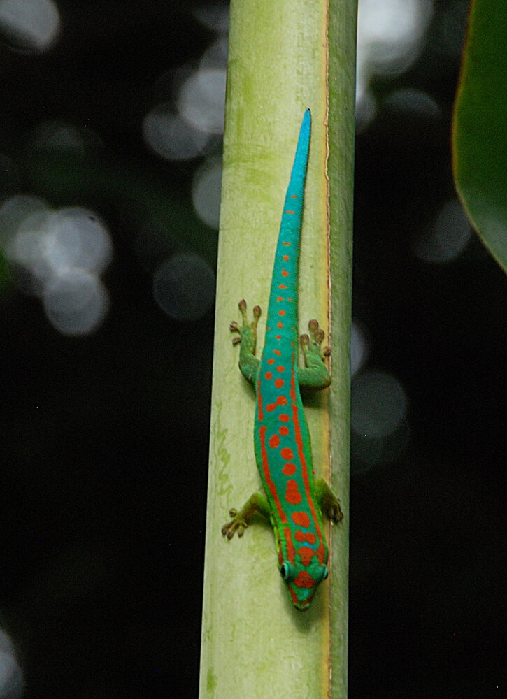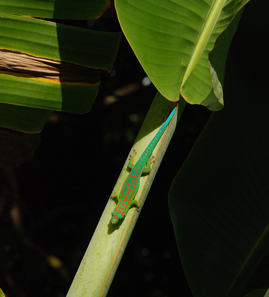 Phelsuma cepediana, a male on Ravenala cf. madagascariensis petiole, Rochester Falls, Mauritius, photo Patrick Blanc