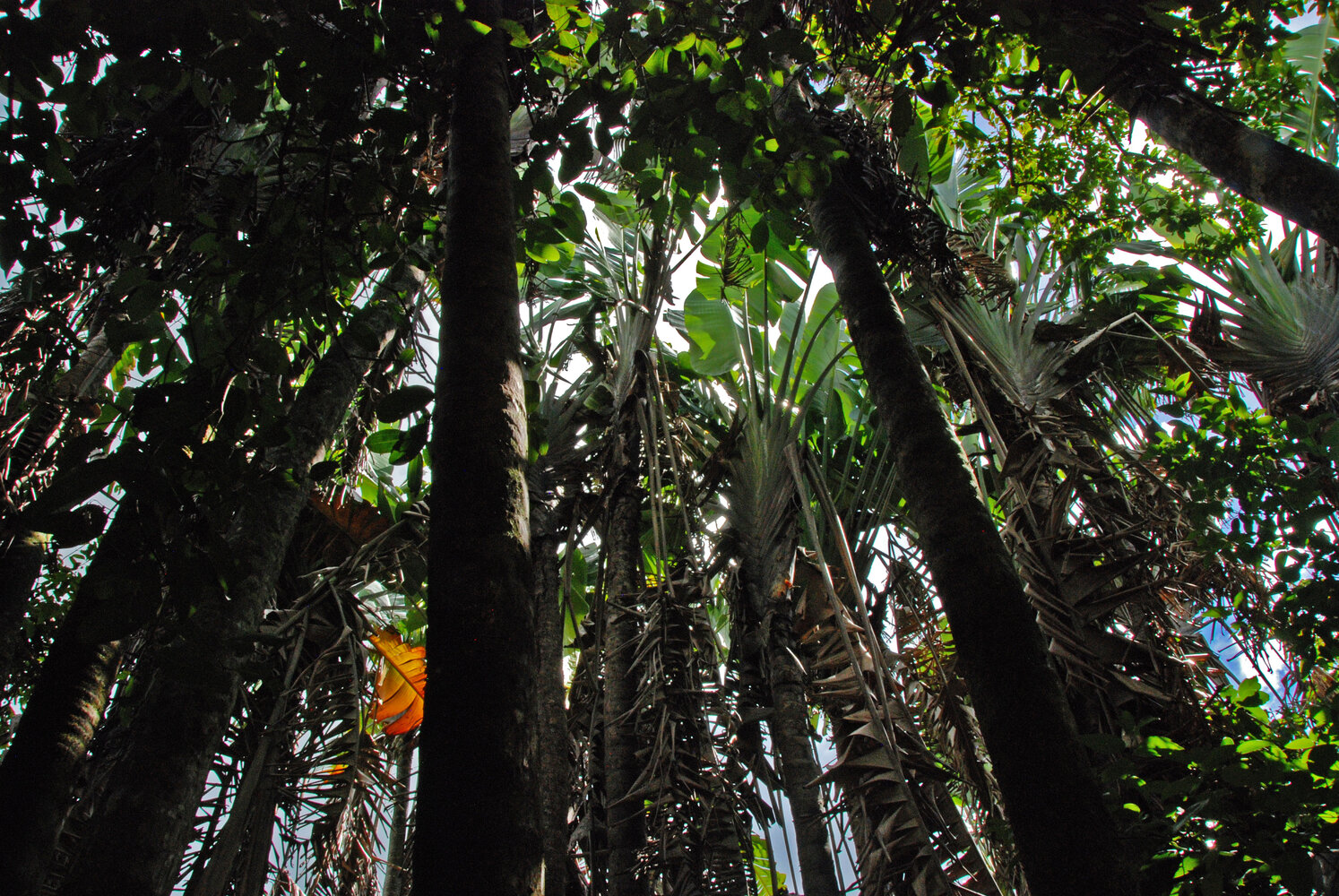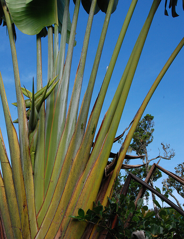 Ravenala cf. madagascariensis, tall leaf canopy made of multiple crowns of simultaneously alive stipes, Ferney, Mauritius, photo Patrick Blanc