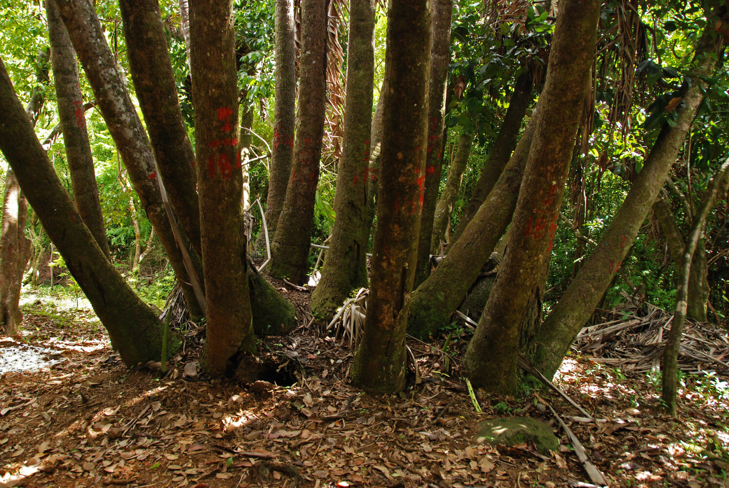 Ravenala cf. madagascariensis, multiple bases of stipes simultaneously alive in a tall suckering clump, Ferney, Mauritius, photo Patrick Blanc