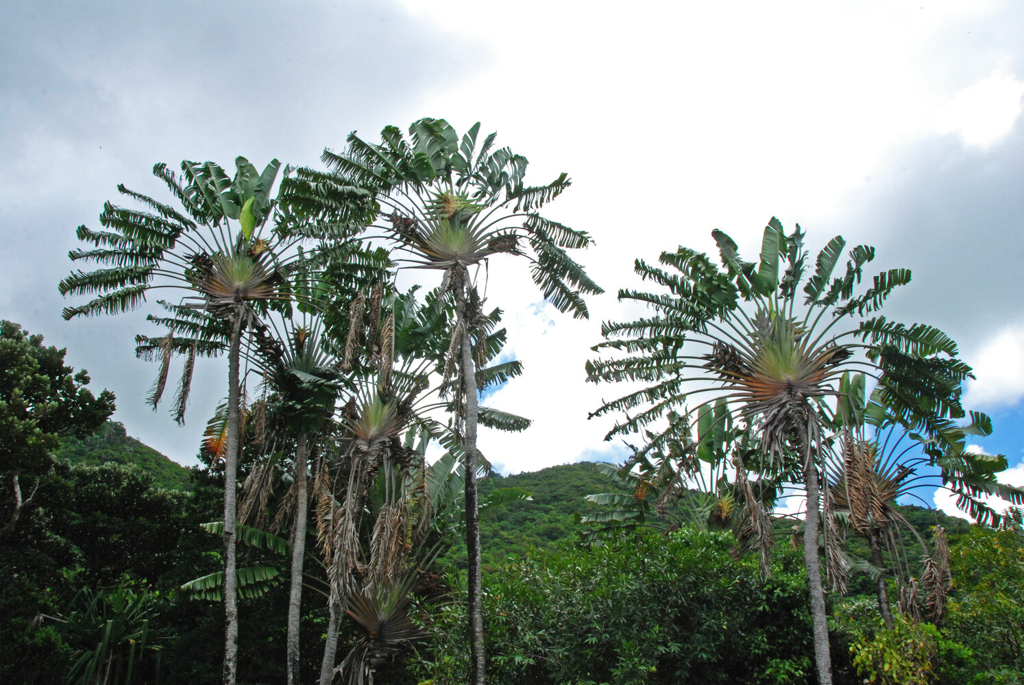 Ravenala cf. madagascariensis, perfectly fan shaped crowns with many inflorescences, Ferney, Mauritius, photo Patrick Blanc